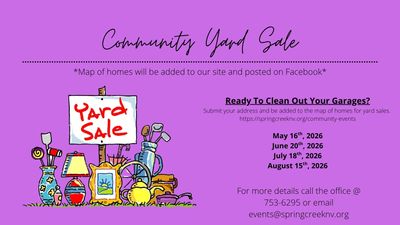 Held on the third Saturdays of the month throughout the Spring and Summer are the community yard sales. If you would like to add to your address to the list and map of homes and participate in the yard sales at your home please click the button below.
